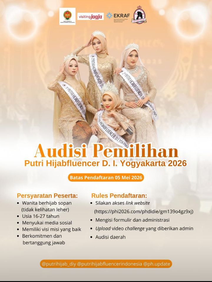 Ingin menjadi sosok yang tidak hanya cantik luar, tapi juga berpengaruh dengan kebaikan? Kini saatnya kamu bersinar di Putri Hijabfluencer DIY 2026!