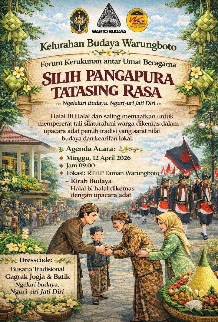 Sementara itu, Ketua Kelurahan Budaya Warungboto, Susanto Dwi Antara, SE, menjelaskan bahwa pemilihan tema ini bertujuan untuk merajut kembali kebersamaan. “Melalui ‘Silih Pangapuro Tatasing Rasa’, kita diajak untuk saling membuka hati, membuang prasangka, dan menyadari bahwa kita semua adalah saudara. Perbedaan keyakinan bukanlah pemisah, melainkan kekayaan yang harus dijaga bersama,” ungkapnya.