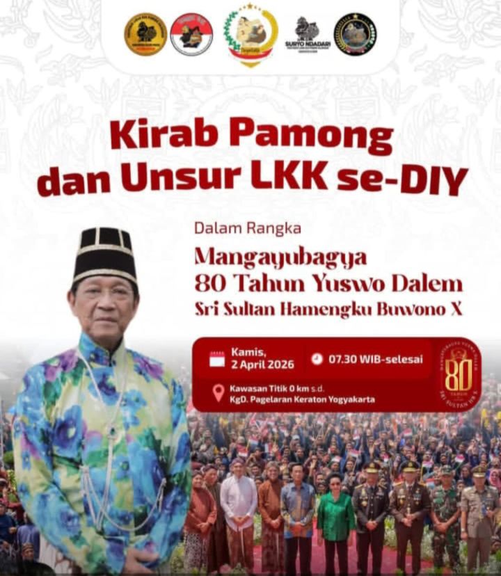 YOGYAKARTA | NasionalKu.com, 2 April 2026 – Kelurahan Warungboto turut serta dalam merayakan Mangayubagya (Hari Ulang Tahun) ke-80 Yuswo Dalem Sri Sultan Hamengku Buwono ke X melalui bagian dari Kirab Pamong dan unsur Lembaga Kemantren Umbulharjo se-Provinsi Daerah Istimewa Yogyakarta (DIY). Dalam acara yang penuh makna ini, warga dan pengurus Kelurahan Warungboto menghadirkan “Sedekah Bumi” sebagai wujud rasa syukur dan penghormatan yang mendalam kepada Sultan.