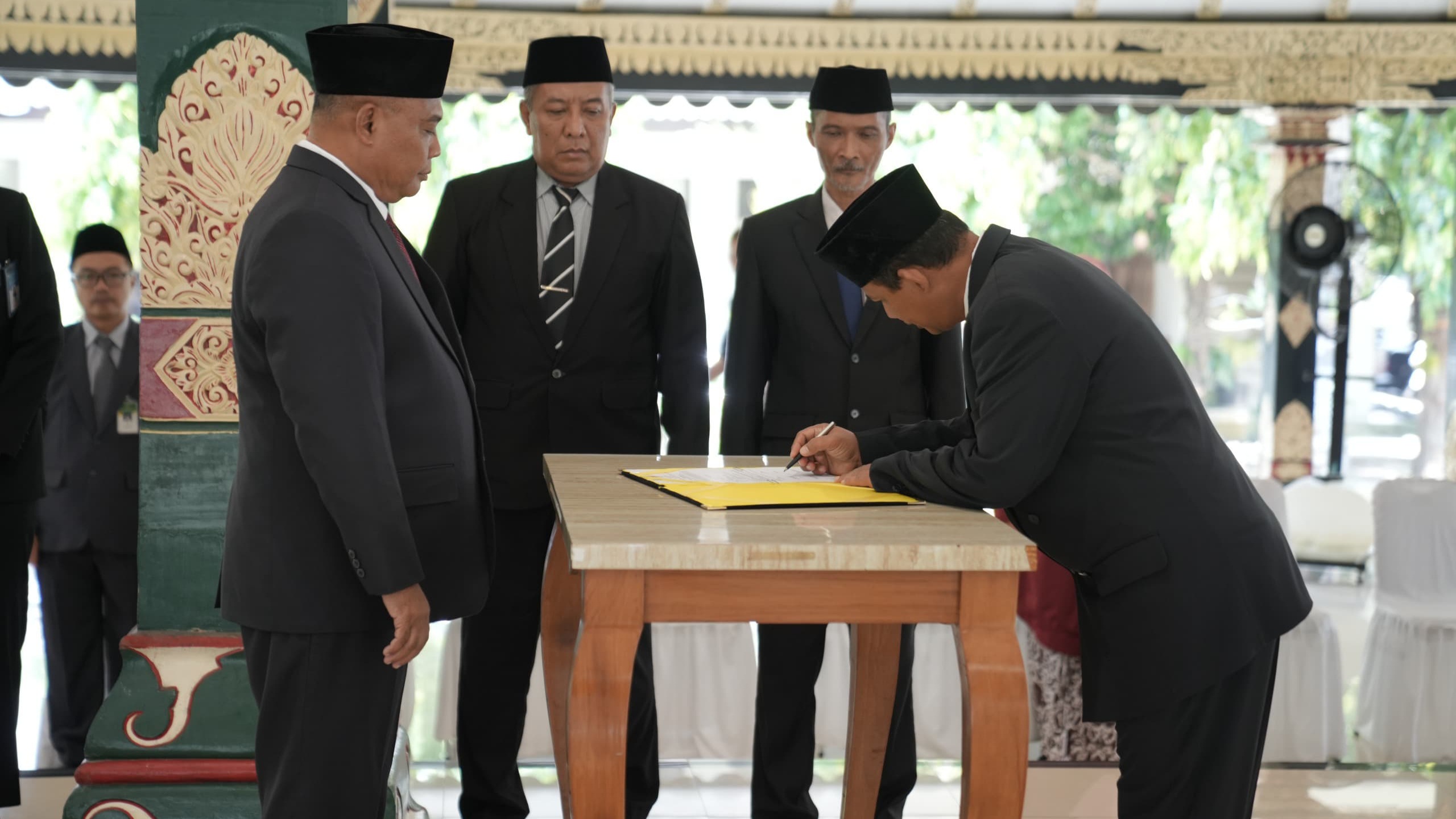 Disaksikan Bupati Sleman Harda Kiswaya Kepala Disdukcapil Sleman terlantik, Arifin menandatangani berita acara.