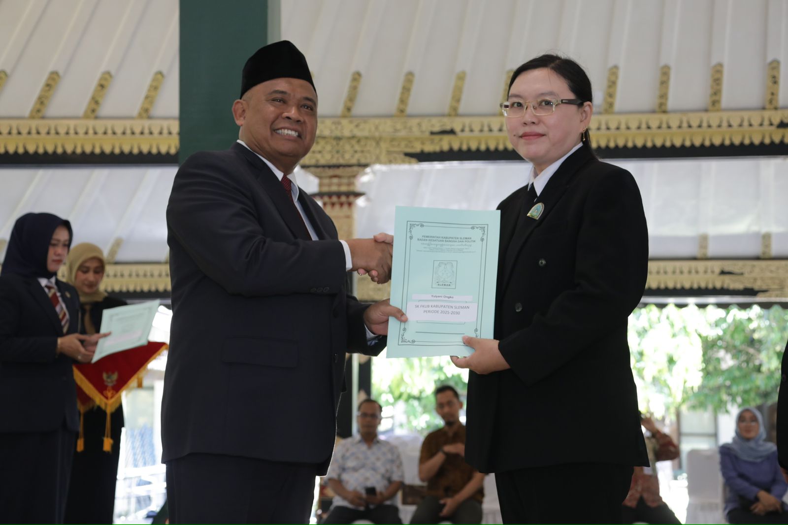 Foto: Bupati Sleman Harda Kiswaya memberikan SK kepada salah satu pengurus FKUB Sleman 2025-2030.
