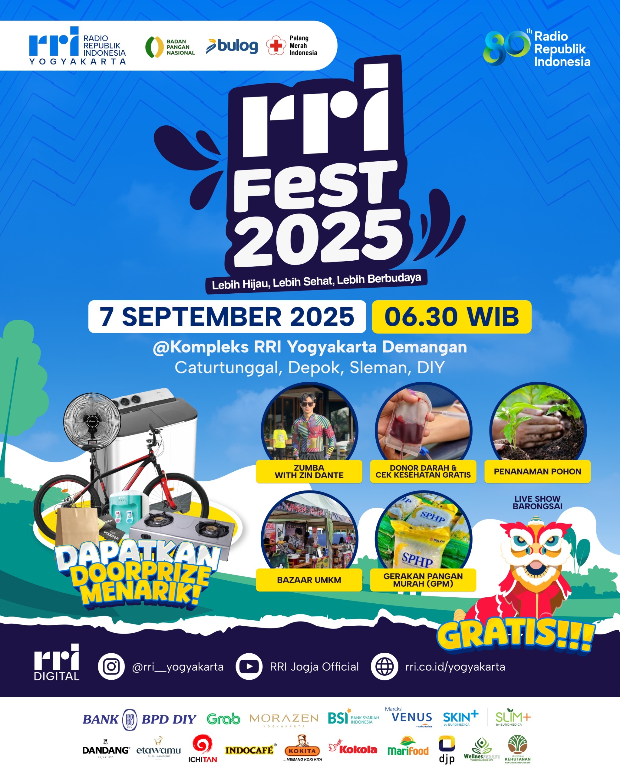 “Kami ingin menjadikan HUT ke-80 ini sebagai wujud rasa syukur sekaligus pengabdian RRI kepada bangsa, khususnya masyarakat Yogyakarta. Melalui RRI Fest, kami hadir lebih dekat dengan kegiatan yang bermanfaat, sehat, dan menyenangkan,” ujarnya.