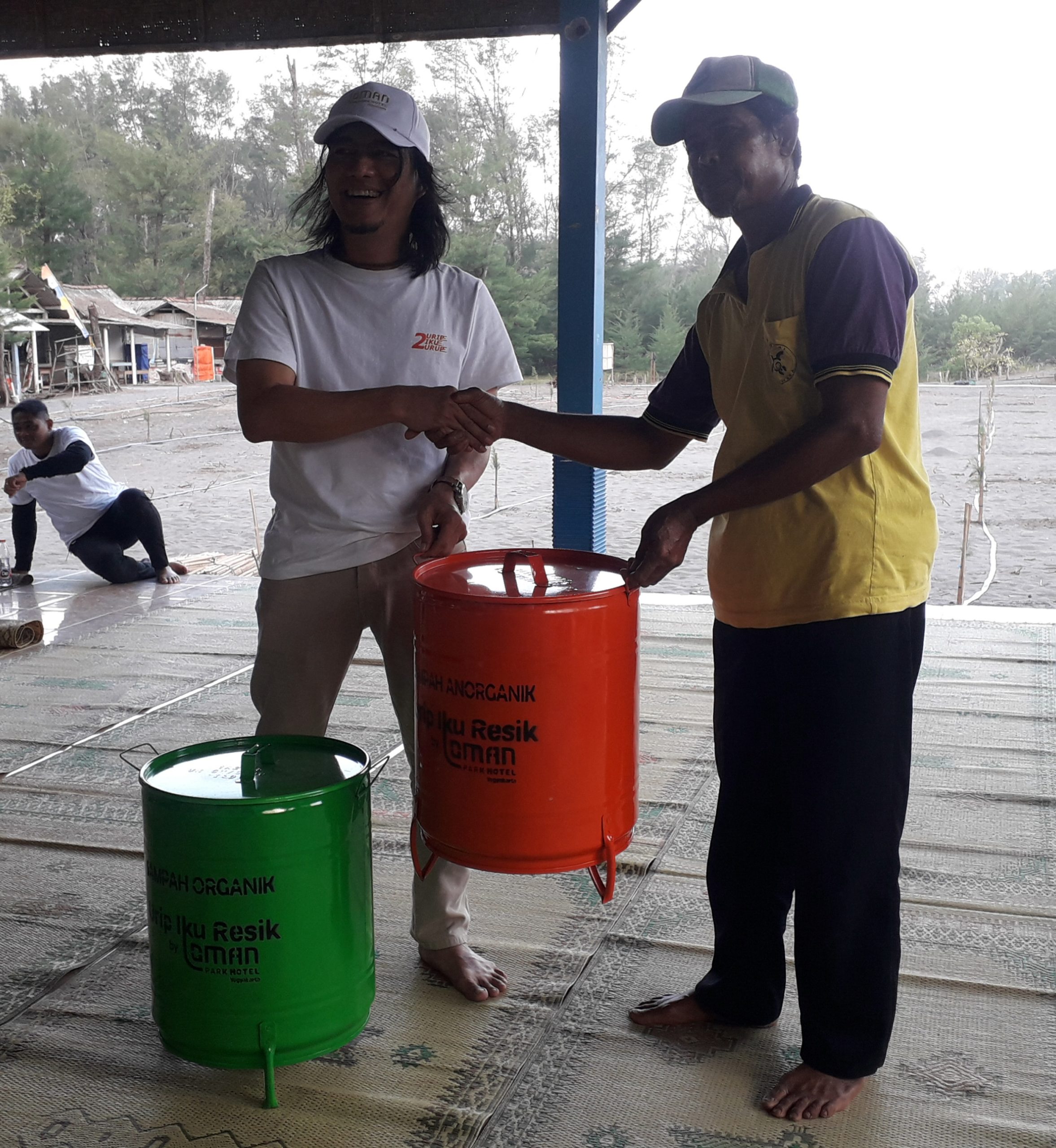 Founder & Managing Director Loman Park Hotel Yogyakarta, Handono S. Putro secara simbolis menyerahkan bantuan tong sampah kepada pengelola Goa Cemara Sumartono.