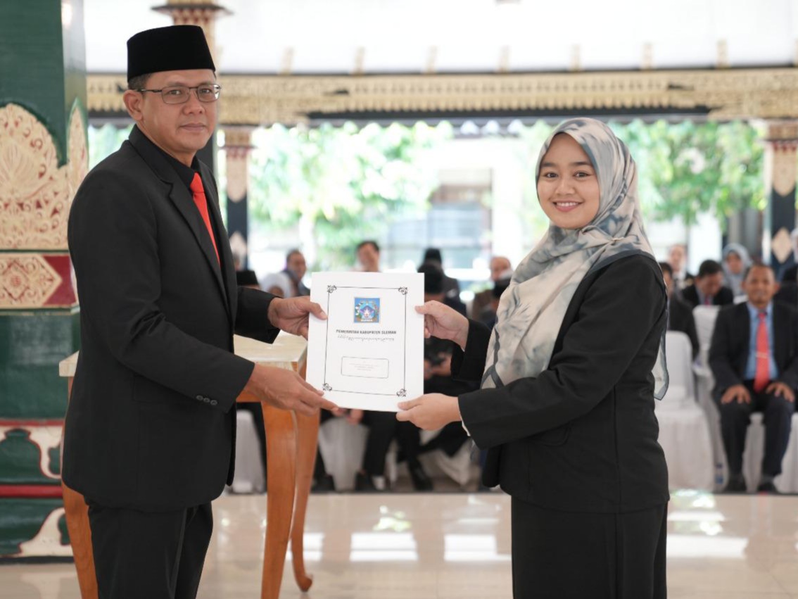Wakil Bupati Sleman Danang Maharsa secara simbolis menyerahkan SK kepada salah satu pejabat terlantik.