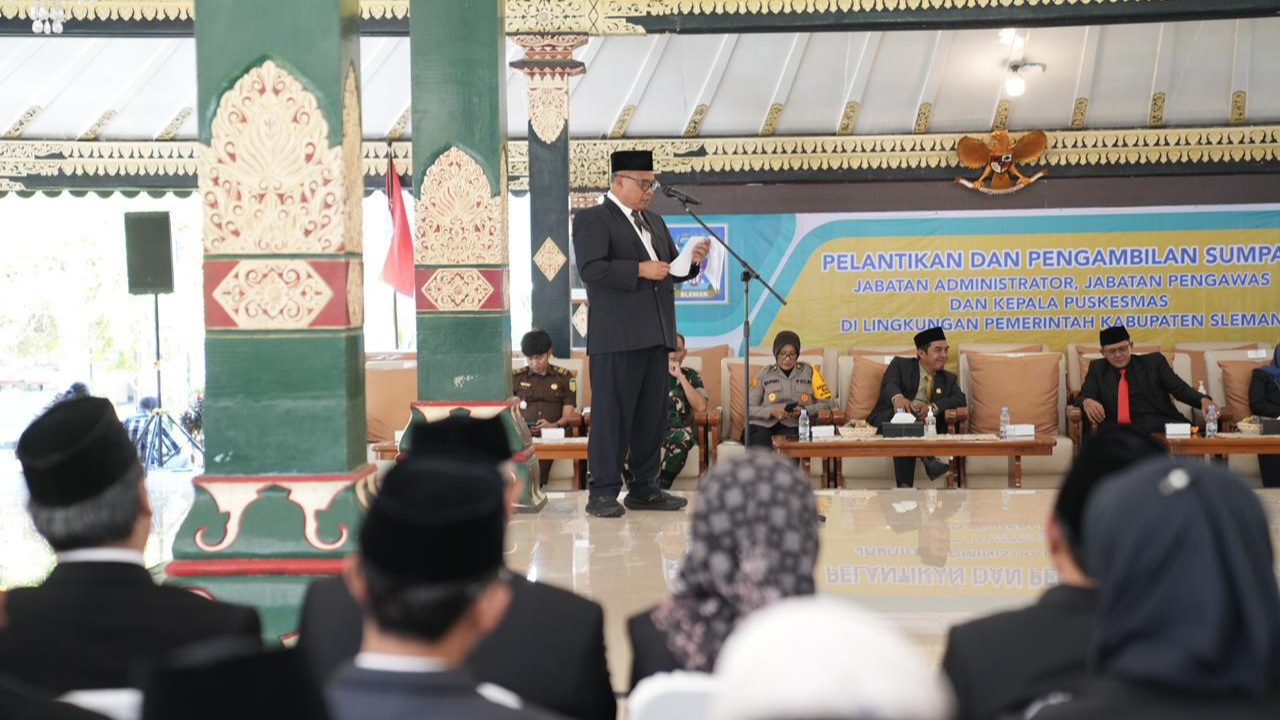 SLEMAN, voicejogja.com – Sebanyak 83 pejabat administrator, pengawas dan kepala puskesmas di lingkungan Pemerintah Kabupaten Sleman resmi dilantik. Pengambilan sumpah dan Pelantikan dilakukan langsung Bupati Sleman Harda Kiswaya bertempat di Pendopo Parasamya Kantor Setda Sleman, Selasa (23/9/2025) siang