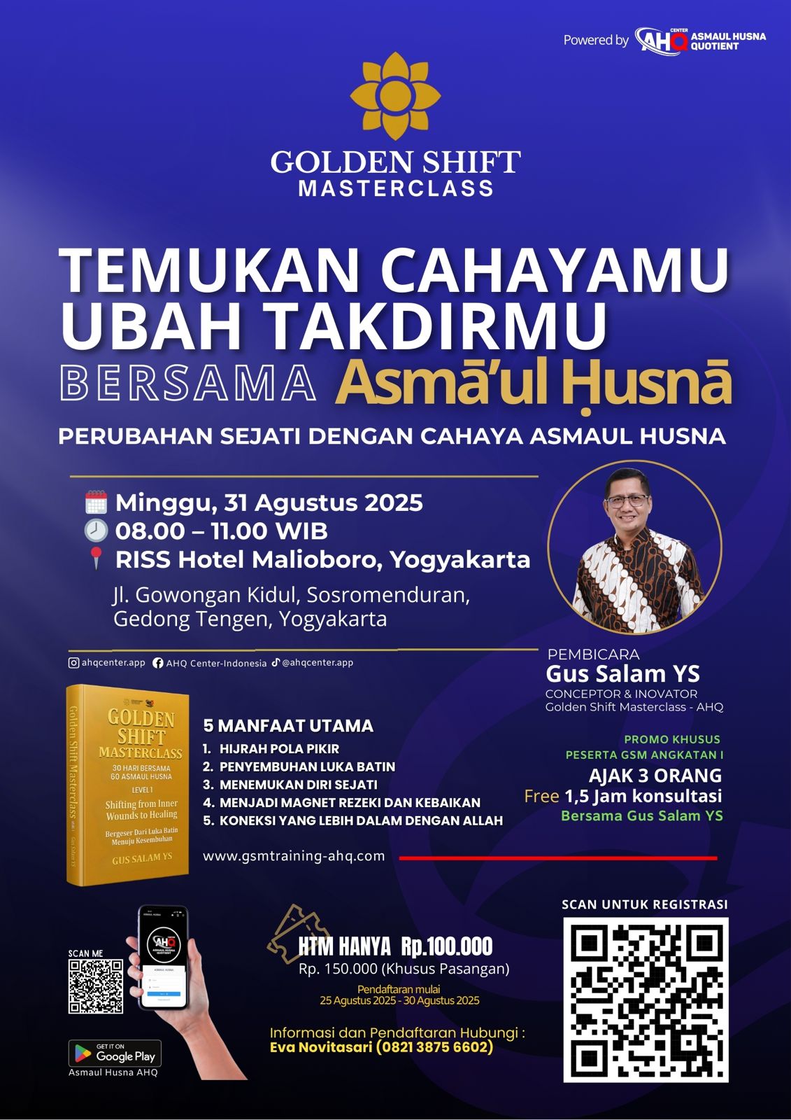 Melihat fenomena itu, AHQ Center Indonesia menghadirkan Golden Shift Masterclass (GSM), sebuah konsep bimbingan ruhani berbasis Asmaul Husna yang menekankan pentingnya transformasi pola pikir dan kesadaran diri.